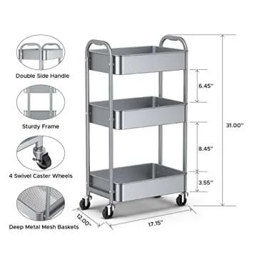 MAX Houser 3-Tier Kitchen Cart Multifunctional Rolling Utility Cart with Lockable Wheels, Storage Craft Art Cart Trolley Organizer Serving Cart Easy Assembly for Office, Bathroom,Kitchen(Silvery-Grey)