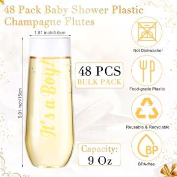 Get ready to elevate your celebrations with the Maxcheck 48 Pcs 9 oz Baby Shower Plastic Champagne Flutes. Perfectly crafted for any occasion, these elegant and durable shatterproof plastic flutes offer a sophisticated touch to your baby shower, wedding, or birthday party. With a clear, stemless design, they mimic traditional glass while being practical for outdoor use, ensuring you don't have to compromise on style for safety. Plus, with a generous 9 oz capacity, each flute is ideal for...