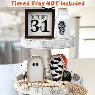 Maxsoins Halloween Decorations Indoor- Apothecary Potion Bottles,Bat Coffin, Ghost,and Halloween Wood Signs & Bead Garland-Farmhouse Decoration for Tiered Tray Table Home Party Decor