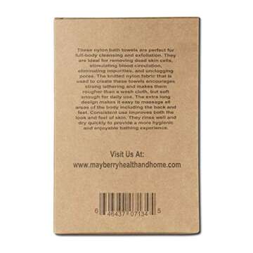 Show moreExperience the ultimate in bathing luxury with the Mayberry Health and Home Extra Long Exfoliating Bath Cloth. Measuring an impressive 36 inches, this premium bath cloth is designed for a thorough and refreshing exfoliation, making it an essential addition to your personal grooming toolkit. The innovative gray nylon material is not only durable but also soft to the touch, ensuring your skin feels invigorated and pampered. Each cloth comes stitched on all sides, which enhances its durability, making it less prone to fraying even with regular use. The 2-pack option ensures you always have a fresh cloth on hand, whether for your daily routine or for guests. Enjoy an easy, effective, and indulgent bathing experience with Mayberry’s expertly crafted bath cloths, designed to elevate your self-care rituals.