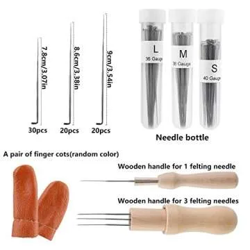The kit includes three sizes of felting needles: 30 fine needles, 20 middle needles, and 20 thick needles.
