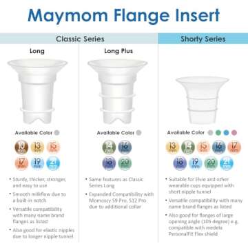 Show more The Maymom 21 mm Flange Inserts are expertly designed to enhance your pumping experience. These innovative inserts seamlessly reduce the 24 mm shield nipple tunnel down to a more comfortable 21 mm size, enabling mothers to find the perfect fit for their unique body shapes and sizes. Crafted from BPA-free, food-grade silicone, these inserts prioritize safety and comfort, ensuring that every pumping session is stress-free. Their compatibility extends not only to Medela PersonalFit and Spectra but also to a range of other popular brands such as Momcozy, LegendairyMilk, and Tsrete. This versatility makes the Maymom inserts a great addition for mothers using different brands of breast pumps.