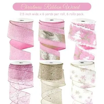 MAYREEL 2.5 Inch Pink and Gold Christmas Ribbon Wired for Christmas Trees Wreaths Tree Toppers Crafts Home Decor Gift Wrapping 6 Rolls Total 36 Yards