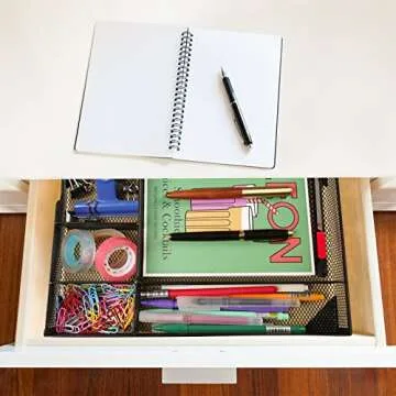 MBVVLZJVN Desk Drawer Organizer,5 Compartments Mesh Drawer Organizer Desk Organizer Tray, Office Supplies Desktop Storage with 2 Pack Binder Clips (Black)