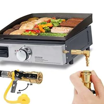 Crafted with premium 100% solid brass material, the propane elbow adapter is designed for durability and reliability. Installation is a breeze thanks to the innovative quick male plug that requires no tools, making set-up quick and hassle-free. With compatibility across a wide range of Blackstone products, it’s an essential addition to your outdoor cooking gear.