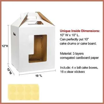Show more Presenting the Mcfleet Tall Cake Boxes: The ultimate solution for bakers and cake enthusiasts! This exquisite set of four cake boxes measures 10x10x12 inches, perfectly crafted to accommodate 10-inch cakes and drums. Say goodbye to transport worries with these robust boxes designed to keep your culinary creations intact and beautifully showcased. Each box features an elegant window that allows a sneak peek of your masterpiece without compromising its safety. Crafted meticulously from three layers of durable corrugated cardboard, these boxes ensure maximum support and protection for even the heaviest tiered cakes.