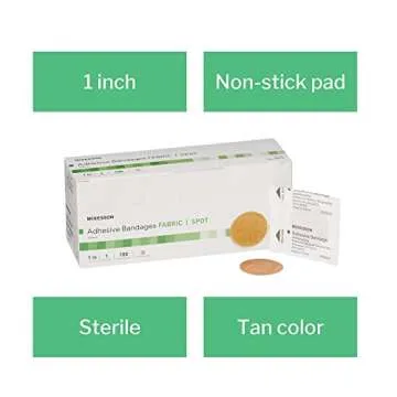 Show moreIntroducing the McKesson Adhesive Bandages – your first aid essential for minor injuries! This pack of 100 sterile, fabric spot bandages is specifically designed to offer superior protection and comfort for cuts and scrapes. Each bandage has a generous 1-inch diameter, making it ideal for those little wounds that need a reliable cover. Crafted from medical-grade flexible fabric, these bandages not only conform comfortably to your skin but also ensure that you stay active without the worry of the bandage peeling off.
