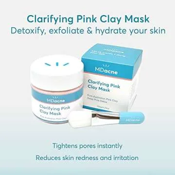 Show more Discover the power of nature with the MDacne Clarifying Pink Clay Mask. Expertly formulated with the purest Australian Pink Clay, this mask is designed to deeply detoxify your skin while providing essential hydration and smoothness. Each application helps remove toxins and pollutants that accumulate on the skin, leaving your complexion looking fresher and brighter. The mask comes with a free applicator brush, ensuring you achieve even coverage and minimize product waste, making skincare simpler and more effective. With a generous 4.2 oz (120g) of product, this is your go-to solution for radiant skin.