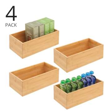 Show moreMeet the perfect solution for all your organization needs with the mDesign Bamboo Wood Organizer Storage Bin Box from the Echo Collection! This exquisite 4-pack set combines sleek, sustainable bamboo wood with intelligent design, making it a stylish yet functional addition to your kitchen, pantry, or drawer. Whether you're corralling snacks, juice boxes, utensils, or beverages like tea and coffee, these versatile storage bins are designed to elevate your space while keeping everything neatly arranged. Their natural wood finish not only looks great but also integrates seamlessly into any decor, offering a timeless aesthetic.