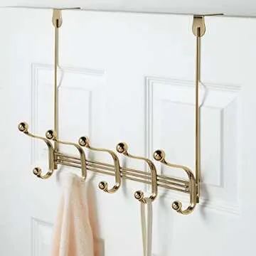 mDesign Decorative Closet Over Door or Wall Mount 10 Hook Metal Storage Organizer Rack for Coats, Hoodies, Hats, Scarves, Purses, Leashes, Bath Towels, Robes - Hyde Collection - Soft Brass