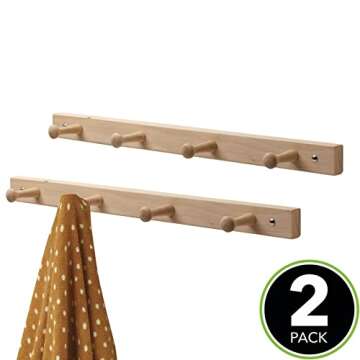 mDesign Decorative Wood Wall Mount 4 Hook Storage Organizer Rack for Coats, Hoodies, Hats, Scarves, Purses, Leashes, Bath Towels & Robes - 2 Pack - Natural Finish
