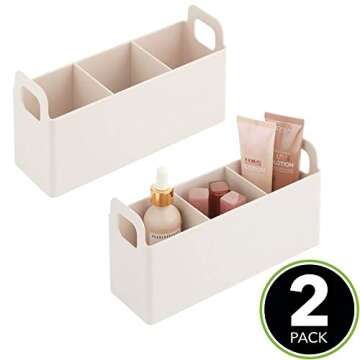 mDesign Divided Plastic Beauty Organizer Bin w/Handles for Bathroom Drawers, Vanity, or Countertops, Storage for Makeup Brushes, Palettes, Blush, Concealers - Lumiere Collection - 2 Pack, Cream/Beige