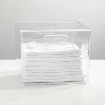 Show more Introducing the ultimate storage solution for your home – these Clear Large Bins designed to maximize organization and accessibility. Created to declutter your space, these bins offer an effortless way to keep your belongings neatly arranged and at your fingertips. Whether you’re looking to organize your closet, pantry, or office, these bins are perfect for storing everything from folded yoga pants to pantry items.