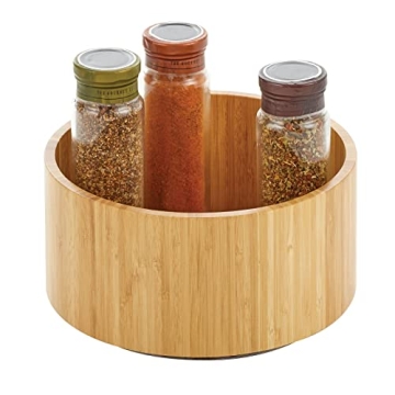 Show more Introducing the mDesign Lazy Susan Turntable Bamboo Spinner, an essential kitchen companion that combines function and style. Crafted from premium bamboo, this fully rotating organizer not only enhances the aesthetic of your kitchen but also maximizes your storage efficiency. Its elegant natural design makes it perfect for any home decor while keeping your favorite condiments, spices, and snacks neatly within reach. Measuring 9 inches in diameter and standing 4.25 inches high, it's the ideal size to fit snugly in your cabinets, pantry shelves, refrigerator, or even on your kitchen countertop.
