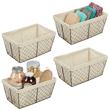 Show more Introducing the mDesign Medium Metal Farmhouse Home Storage Organizer Basket - an ideal blend of functionality and style. This set of four beautifully designed baskets features a charming chicken wire aesthetic paired with a fabric liner, giving your home the cozy farmhouse touch it deserves. Perfectly sized for various spaces, these elegant storage solutions help keep your kitchen pantry, bathroom, or living room neat and organized. With dimensions of 8" x 11.75" x 5.5", they fit seamlessly on shelves and countertops, making them a versatile addition to any room.