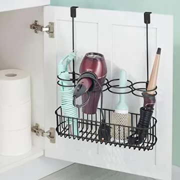 mDesign Metal Bathroom 4 Section Storage Tool Organizer Basket Tray - Hang Over Cabinet Door - Storage for Hair Dryer, Straightener, Curling Iron, Styling Products - Concerto Collection - Black