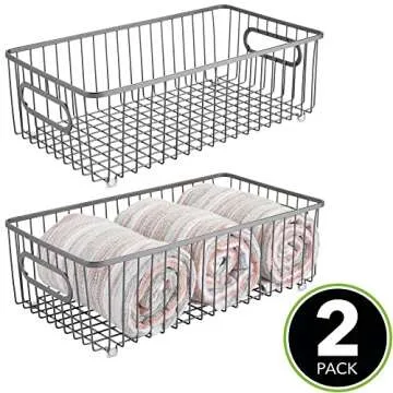 The mDesign storage baskets are made from high-quality metal with a decorative wire grid design.
