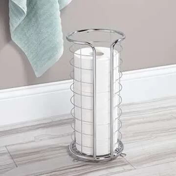 Show more Discover the ultimate solution for your bathroom storage needs with the sophisticated mDesign Toilet Tissue Holder. This elegantly designed stand is not just functional but serves as a decorative piece that complements any bathroom decor. Made from premium materials, it offers stability and ease of use, ensuring that your toilet paper is always within easy reach. Its sleek chrome finish is resistant to corrosion, making it an ideal choice for humid environments. The generous opening allows you to fit even the largest rolls, such as double and triple rolls, without hassle.