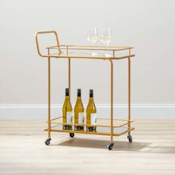 mDesign Metal Vintage Beverage Rolling Cart for Home - 2-Tier Serving Bar Trolley with Easy-Glide, Rotating Wheels, Built-in Handle, and Glass Shelves for Wine and Craft Beer - Soft Brass