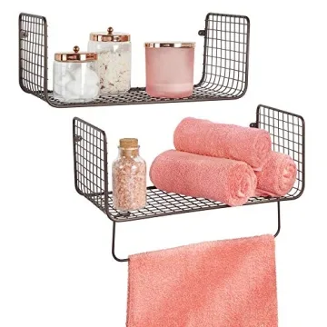 Show moreTransform your bathroom, kitchen, or laundry room with the mDesign Metal Wire Farmhouse Wall Decor Storage Organizer Shelving Set. This two-piece set combines functionality with farmhouse charm, offering a stylish solution to your storage needs. Made from strong steel wire with a durable rust-resistant bronze finish, these shelves are designed to last. Arrives fully assembled and ready to mount with included hardware, making installation a breeze. Perfect for organizing towels, toiletries, and more, these shelves are a must-have for any home.