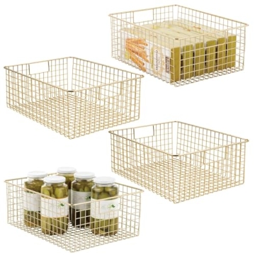 Show moreIntroducing the mDesign Metal Wire Food Storage Basket Organizer, a stylish and practical solution for transforming your cluttered cabinets and shelves into an organized oasis. Crafted from durable steel wire, these versatile baskets not only offer ample storage space but also feature elegant soft brass accents that seamlessly blend with any home décor. Each set includes four generously sized baskets (16" x 12" x 6") that are perfect for keeping your essentials tidy and accessible. Whether you need to store pasta, snacks, cleaning supplies, or baby items, these baskets adapt to meet your needs, making organization easy and efficient.