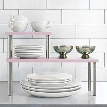 mDesign Modern Metal 3-Tier Kitchen Countertop and Pantry Cabinet Storage Shelf Organizer Stand for Storing Mugs, Bowls, Spices, Baking Supplies - Free Standing, 2 Shelves - Blush Pink/Brushed