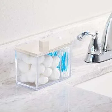 mDesign Modern Square Bathroom Vanity Countertop Storage Organizer Canister Jar for Cotton Swabs, Rounds, Balls, Makeup Sponges, Bath Salts - 2 Divided Sections - Clear/Cream