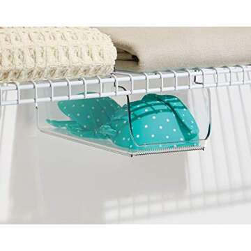 Show more Introducing the mDesign Plastic Hanging Closet Storage Organizer Tray, a versatile and stylish storage solution designed to maximize your closet space. This small bin is expertly crafted to hang effortlessly from wire shelves, making it an ideal addition to bedrooms, linen closets, entryways, and hall closets. With its crystal-clear design, this organizer not only helps you corral your belongings but also allows for easy visibility of contents, so you can find what you need at a glance. Whether you want to neatly store leggings, t-shirts, sports bras, winter scarves, belts, or gloves, this compact tray keeps everything organized and easily accessible.