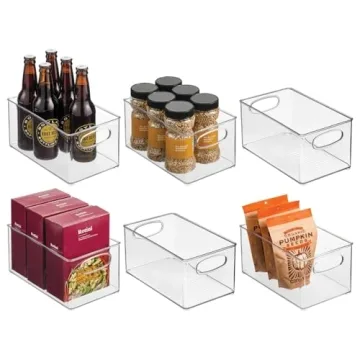 Show more Introducing the mDesign Plastic Kitchen Organizer - Storage Holder Bin from the prestigious Ligne Collection, designed to enhance your organization efforts in kitchens, pantries, and beyond. This premium set of six clear bins provides a clean and simple solution for organizing everything from snacks and canned goods to small kitchen supplies. Each bin, thoughtfully sized at 10" x 6" x 5", perfectly fits most pantry shelves, cupboard spaces, and refrigerators. Made from high-quality, durable plastic, these bins not only look great but are built to withstand daily use, ensuring that you can easily see and access your food and kitchen essentials.