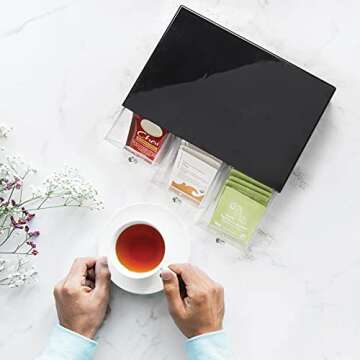 Show more Introducing the perfect storage solution for tea lovers - this versatile tea organizer is a blend of functionality and style! Constructed from high-quality thick plastic, this tea holder features multiple drawers designed to accommodate a variety of tea packets. With its sleek black and clear design, it looks stunning on any countertop or desk while keeping your tea collection organized.