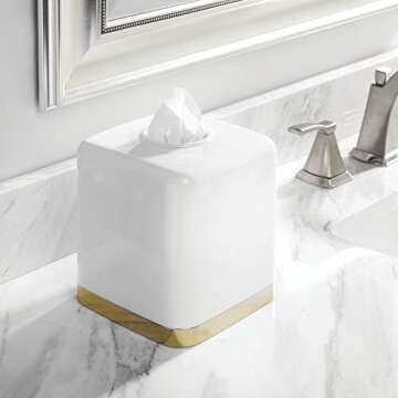 mDesign Plastic Square Disposable Facial Tissue Box Cover for Bathroom Vanity, Countertop, Bedroom Dresser, Night Stand, Office Desk, End Table, Hold Paper Tissues - Hyde Collection - White/Soft Brass