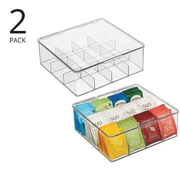 Show moreOrganize your kitchen and elevate your tea experience with the mDesign Plastic Stackable Tea Bag Storage Bin Organizer Box Holder. This elegant solution brings both functionality and aesthetic appeal to your countertops, pantry, or cabinets. Designed with stackability in mind, these bins efficiently maximize space without compromising on accessibility. Each container is made from durable, clear plastic, enabling you to easily identify your favorite tea varieties without having to rummage through cluttered drawers. The built-in lid keeps your tea bags fresh while preventing dust and moisture from affecting their flavor. This 2-pack allows you to separate different tea types or create a designated space for coffee pods and beverage packets.