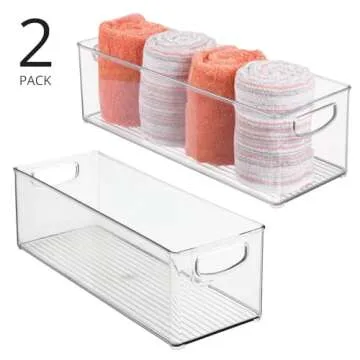With smart storage that maximizes utility, this two-pack of bins is ideal for streamlining all your bath and beauty essentials. Their spacious interior provides ample room for a assorted items, and the portable & stackable features—complete with built-in handles—make moving and rearranging a breeze. Whether tucked neatly in a cabinet or proudly displayed on a countertop, this organizer set is designed to enhance accessibility while minimizing clutter. Its open top ensures you can grab what you need, when you need it, saving you valuable time.