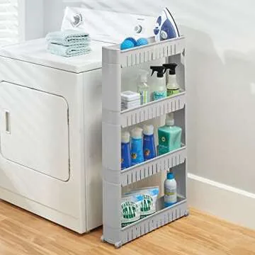 mDesign Portable Slim Plastic Rolling Laundry Utility Cart, Storage Organizer Trolley - Easy-Glide Wheels and 4 Heavy-Duty Shelves, for Laundry, Utility Room, Kitchen or Pantry Storage - Gray
