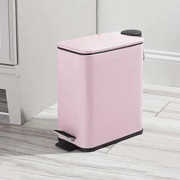 mDesign Slim Metal Rectangle 1.3 Gallon Trash Can with Step Pedal, Easy-Close Lid, Removable Liner - Narrow Wastebasket Garbage Container Bin for Bathroom, Bedroom, Kitchen, Office - Matte Blush Pink