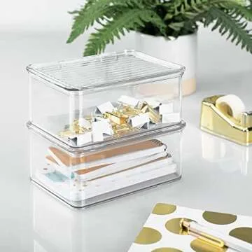 mDesign Small Plastic Home Office Storage Organizer Box Containers w/Hinged Lid for Desktops - Holds Pens, Pencils, Sticky Notes, Highlighters, Staples, Supplies - Lumiere Collection, Clear