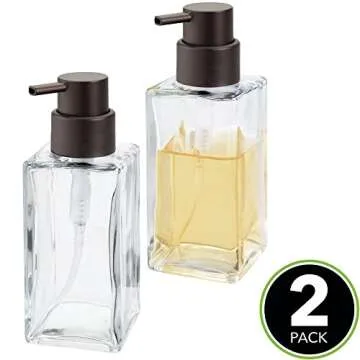 Show moreIntroducing the mDesign Square Glass Refillable Liquid Soap Dispenser Pump Bottle set, designed to elevate the decor of your bathroom and kitchen alike. This stylish yet functional duo features a chic square glass design coupled with a beautiful bronze pump, making it a perfect addition to any countertop. With the ability to hold hand soap, dish soap, hand sanitizer, or even essential oils, these dispensers offer versatility without compromising on style. Whether you are looking to create a cohesive look in your home or simply want an easy way to dispense your favorite liquids, these refillable soap dispensers are an excellent choice.