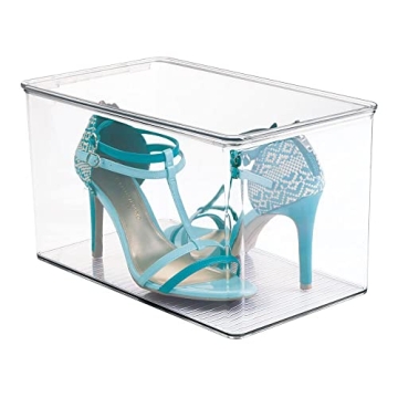 Show more Introducing the mDesign Stackable Plastic Closet Storage Container Bin Box from the elegant Lumiere Collection, designed to transform your storage experience. Say goodbye to clutter and chaos with a smart solution that keeps your shoes and accessories organized and within easy reach. Crafted from durable, shatter-resistant plastic, this clear storage bin features a hinged lid that opens effortlessly, allowing for quick access to your favorite footwear, from heels and pumps to flats, sandals, and boots. Its spacious design is versatile enough to accommodate various items, making it a must-have for any organized home.