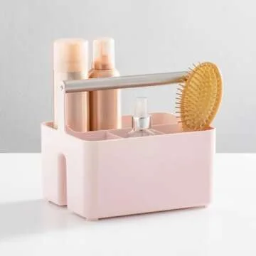 mDesign Under Sink Storage – Plastic and Metal Bathroom Caddy – Portable Cosmetics Storage Organiser – Light Pink/Matte Silver