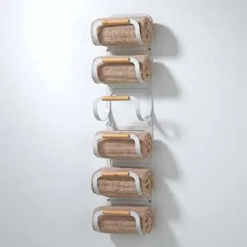 mDesign Wall Mount Towel Storage Rack for Bathroom - 6-Tier Hanging Organizer Mounted Holder Shelf for Multiple Bath Towels or Robes - Steel Metal and Wood - Yami Collection - Matte White/Natural