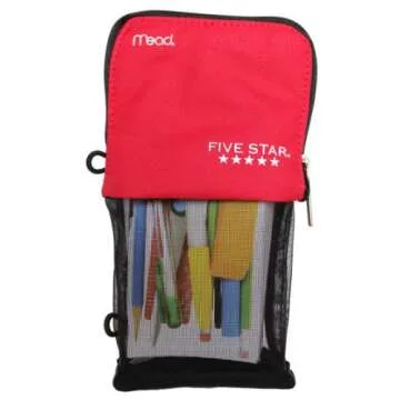 Show moreElevate your organizational game with the Mead Five Star Stand and Store Self Standing Pencil Pouch. Crafted thoughtfully to combine style with functionality, this striking red pencil pouch is not just a storage solution; it's a statement of efficiency. Measuring at a convenient 8 in x 4 1/2 in, it offers ample space for your writing essentials, providing quick access to pens, pencils, and other stationary items. The innovative design features micromesh panels that allow you to see your supplies at a glance, minimizing the time spent rummaging through your tools. Whether you're a student, a professional, or an artist, this versatile pencil pouch is sure to meet your demands and keep your workspace tidy.