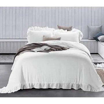 meadow park 100% Stone Washed French Linen Duvet Cover Set 3 Pieces - Super Soft, King Size 104 inches x 92 inches, Shams 20 inches x 36 inches, Ruffled Style - Button Closure - Corner Ties, White