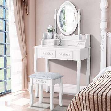 Show moreElevate your beauty routine with the mecor Vanity Table Set, an exquisite blend of functionality and style, designed for both girls and women who appreciate elegance in their space. This stunning white vanity includes a makeup table with a generous four drawers, an oval rotating mirror that offers 360° spinning capability, and a comfortable free cushioned stool. Perfectly sized and thoughtfully crafted, this vanity set not only makes your makeup application a breeze but also adds a touch of sophistication to your bedroom.