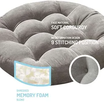Show more Discover the ultimate blend of style and comfort with the Degrees of Comfort Meditation Floor Pillow Set. These stunning round cushions, measuring a generous 22 inches in diameter and a thickness varying from 3.15 to 3.94 inches, are designed specifically for adults seeking a cozy lounging experience. Crafted from luxurious soft corduroy fabric, each pillow not only looks fabulous but feels delightful against your skin, making every seat an inviting spot for relaxation, meditation, or social gatherings. With a stylish tufted design and a chic grey color, they seamlessly blend with your home decor, enhancing the overall aesthetic while providing necessary support.
