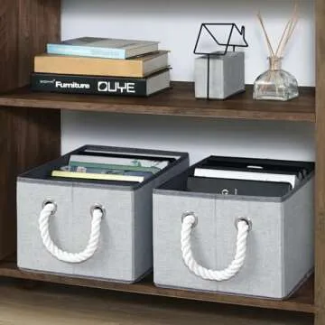 Medium Fabric Storage Bins with Lids 3 Packs,Folding Storage Baskets for Organizing with Cotton Rope Handles,Rectangle Organizer Bins for Magazine with Metal Snap,Gray,12.20"x9.45"x6.69"