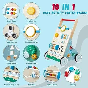This multifunctional wooden baby walker comes loaded with engaging features including a mirror, spinning sun duke, and block matching activities, all crafted to support the development of multiple skills. Each component, from the fingertip gyro to the flip chart board, is designed to stimulate various senses, promoting balance, color recognition, and creativity. Your child will be captivated for hours!