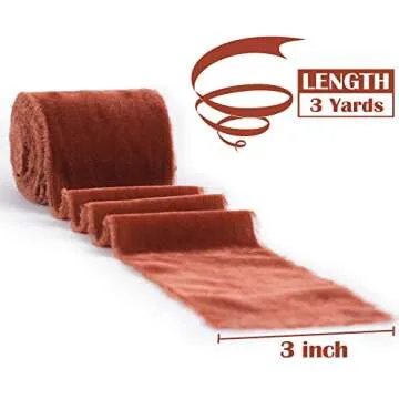 Show more Discover the luxurious touch that our MEEDEE Rust Velvet Ribbon brings to any occasion! Handcrafted with meticulous care, this rich rust-colored ribbon measures a generous 3 inches in width and spans a seamless 3 yards, providing ample length for a variety of creative uses. Each piece is uniquely hand-cut and dyed, featuring beautifully frayed edges that exude rustic charm while maintaining a super soft texture. The stunning sheen of the high-quality silk velvet gives this ribbon an elegant appearance, making it the perfect choice for all your celebratory needs.