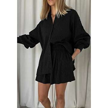 Button v neck long sleeve blouse shirts, oversized puff sleeve tops, button down lounge set