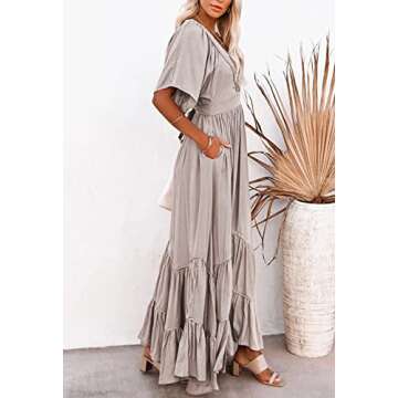 Meenew Women's Casual Long Summer Dress Plunge V Neck Ruffle Maxi Beach Dress L Light Pink