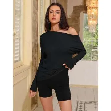 Meetrendi Women's Asymmetrical Long Sleeve Top Off Shoulder Oversized T Shirts 2025 Loose Fit Casual Workout Tee Black